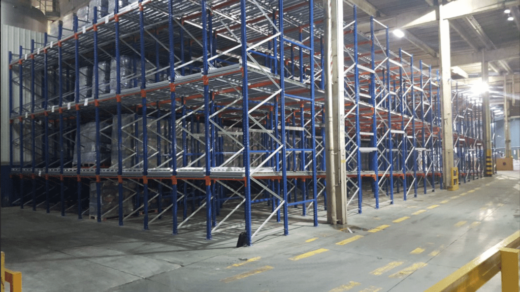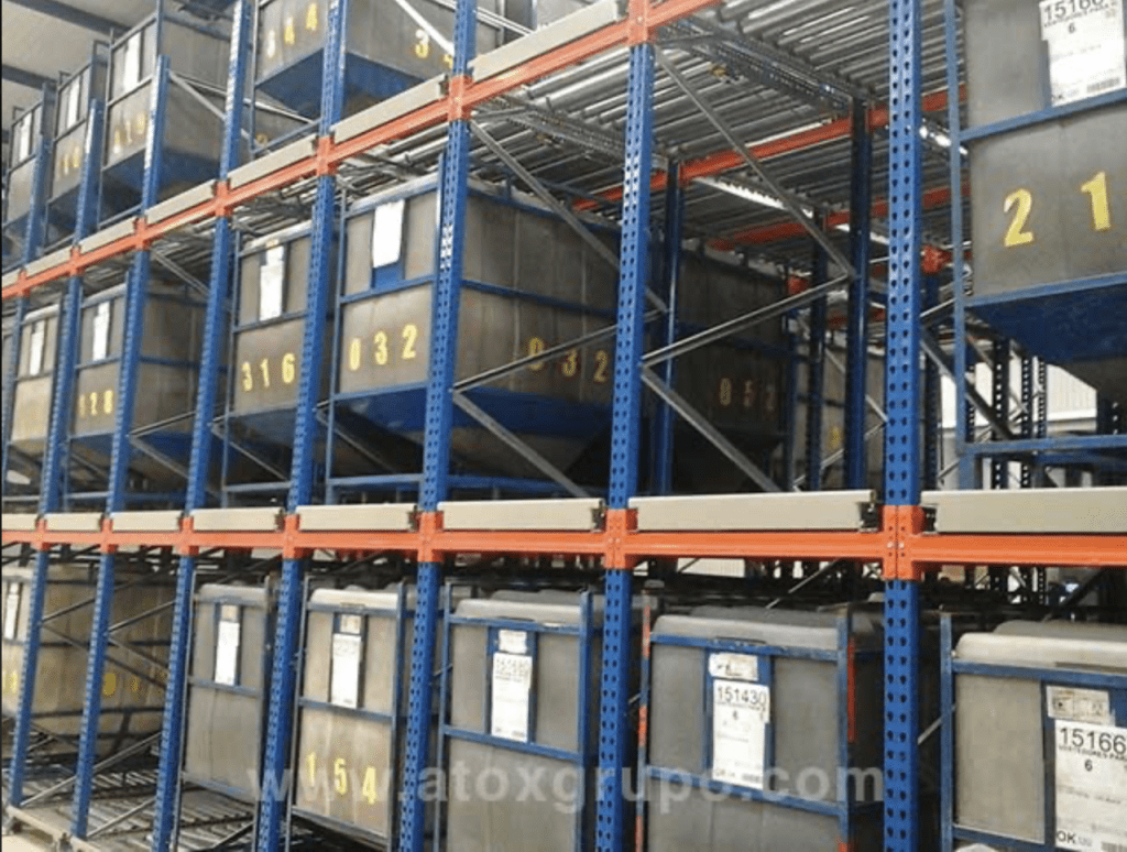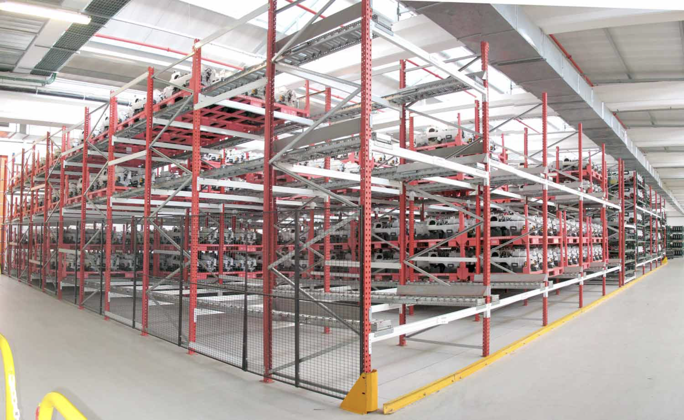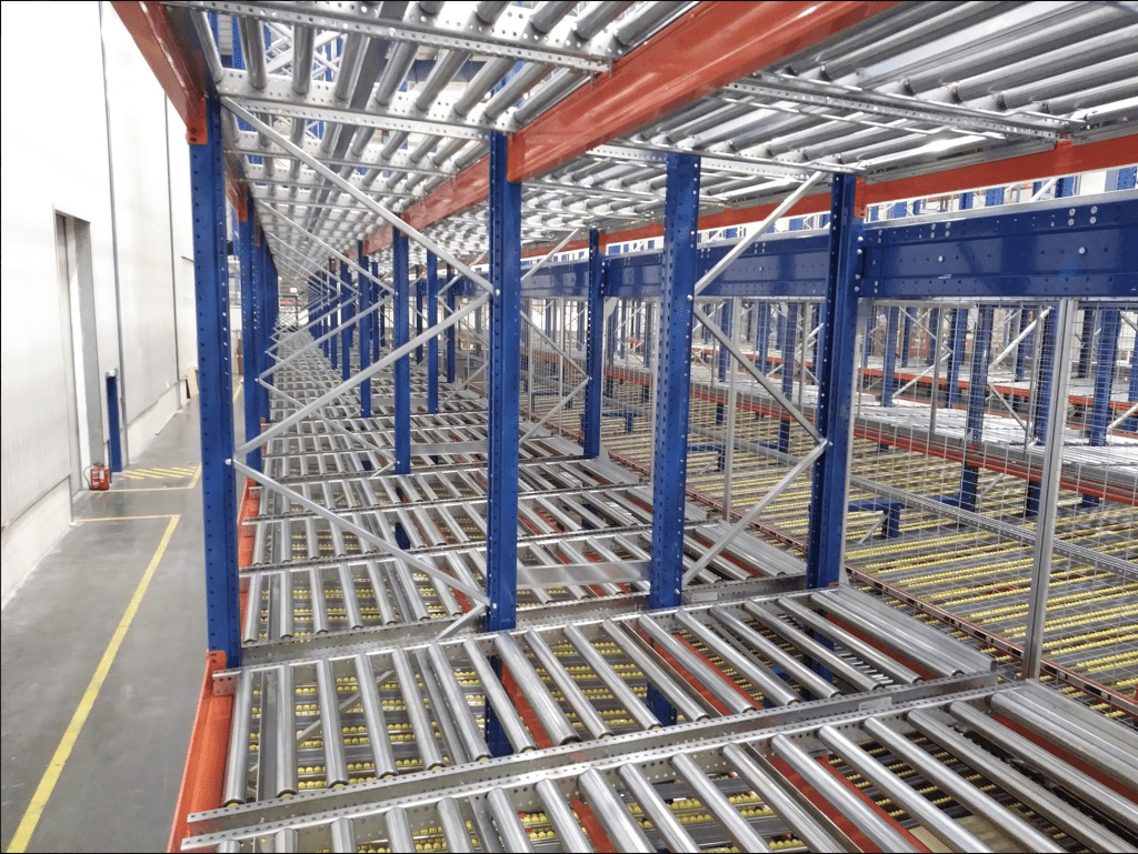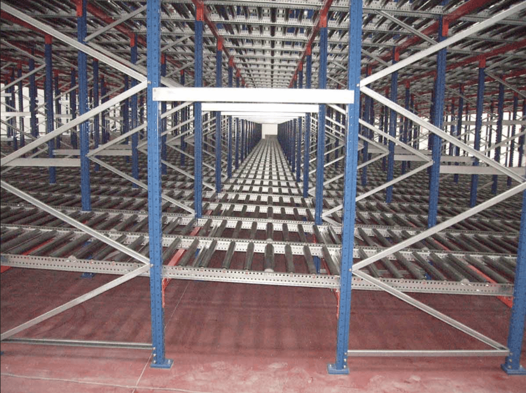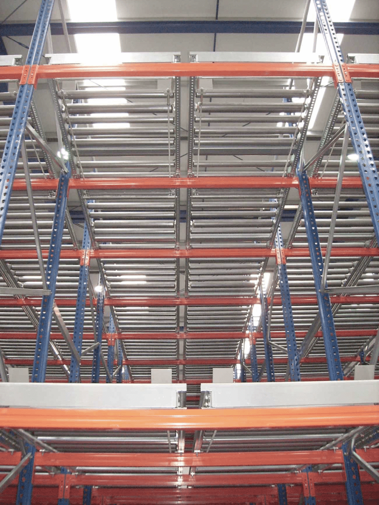 O sistema dinâmico é constituído por estruturas metálicas equipadas com pistas inclinadas que permitem o deslocamento controlado das paletes por ação da gravidade. As paletes são introduzidas num extremo da estanteria e deslocam-se automaticamente até à frente de descarga, ficando sempre disponíveis para recolha.